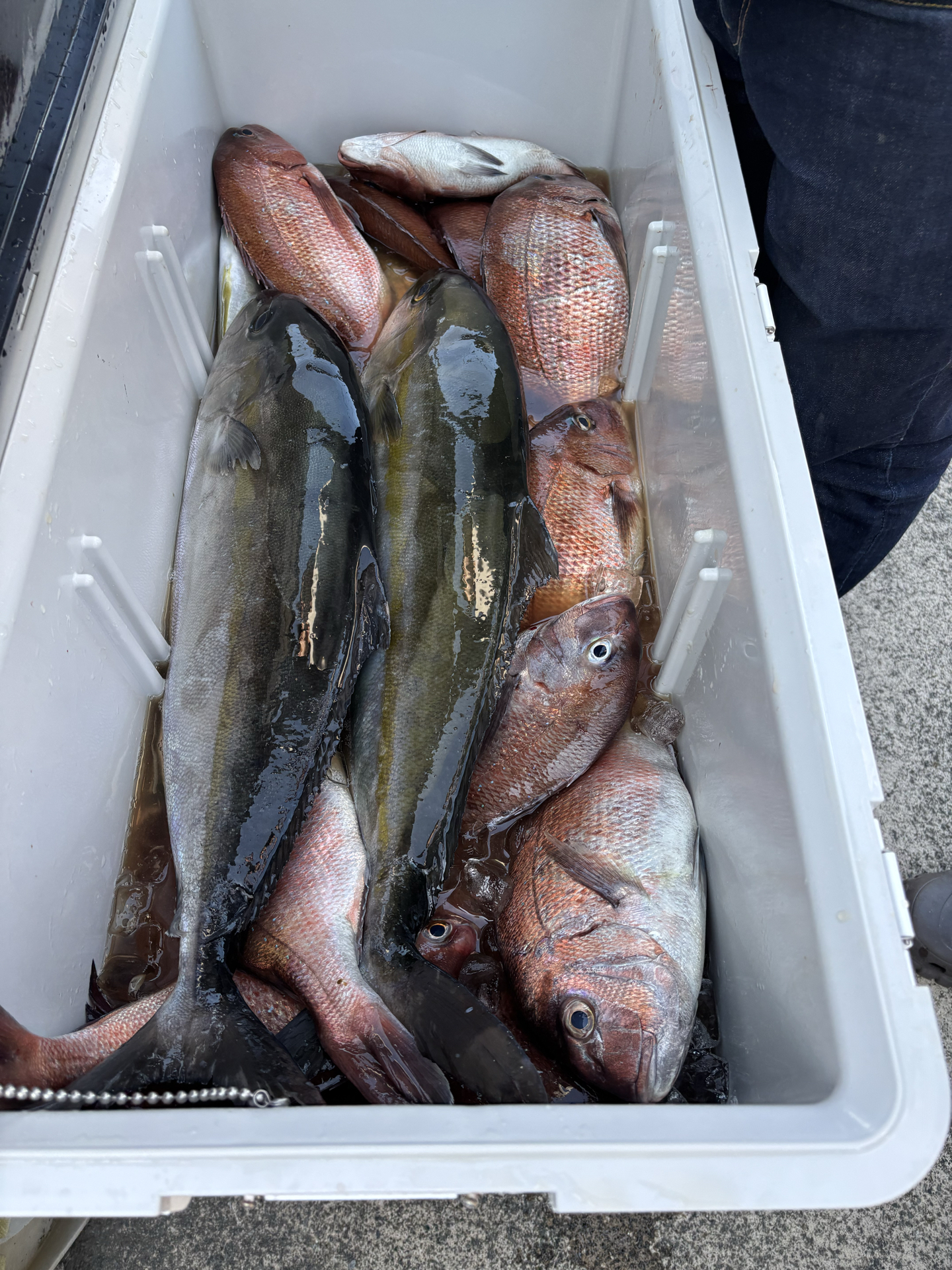 早朝から海釣りを楽しみ、メンバーからは、タイやカンパチなどが次々と釣り上げられました!